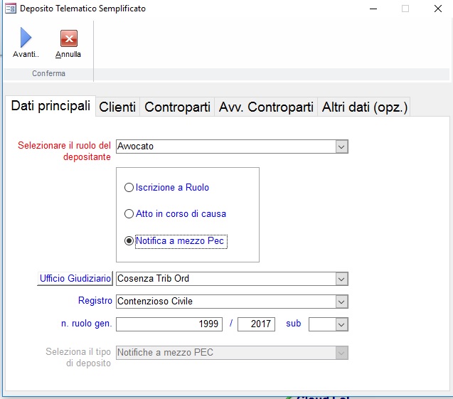 Cliccare su AVANTI o sulla scheda CLIENTE, per inserire i dati del proprio cliente, che Principe consente di prelevare anche in maniera automatizzata (prelevando il nome ed i relativi dati dall’anagrafica clienti del programma). Stessa operazione dovrà essere obbligatoriamente compiuta con i dati della o delle controparti, e del difensore di controparte (se presente)