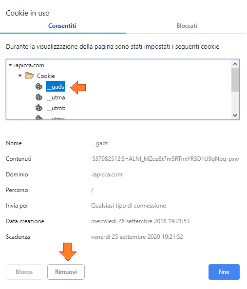 Poi dalla finestra di popup, seleziona il cookie indesiderato e clicca su BLOCCA.